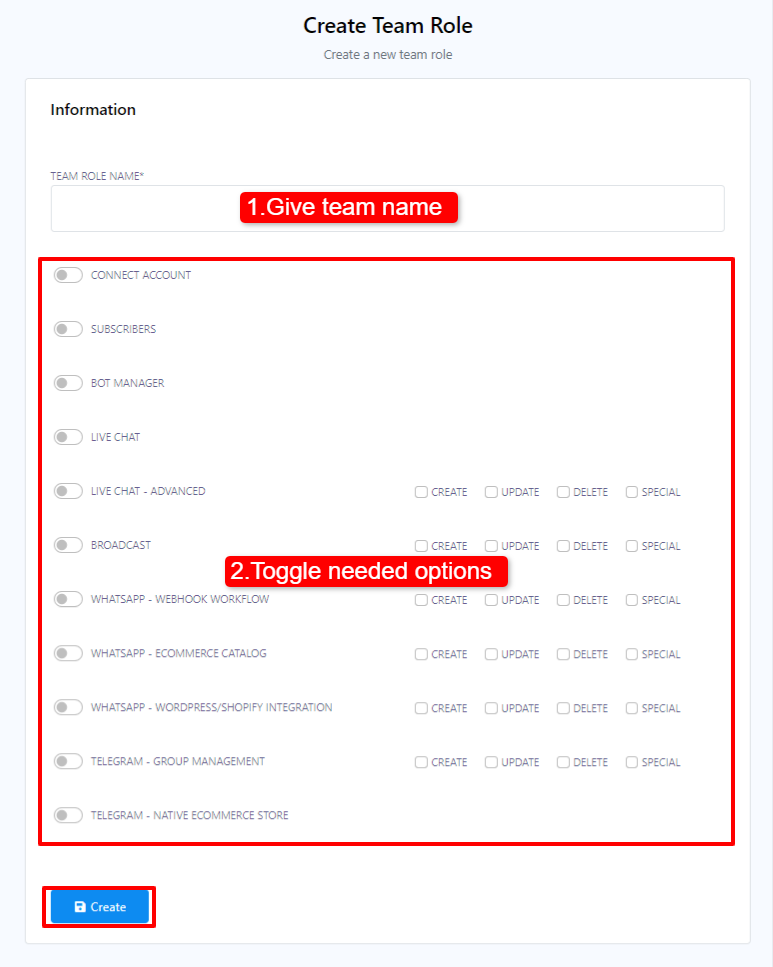 In our chatbot platform, a team role defines the specific duties assigned to each team involved in managing different tasks. A team can comprise multiple members. The process of adding team members is outlined in the Team section of our platform. To assign tasks to team members, you first need to establish a team role and then assign permissions for the tasks you want the team members to handle.